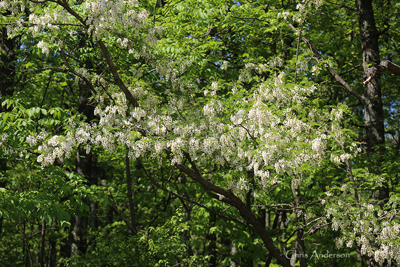 With creamy white panicles resembling wisteria, the flowers of black locust (Robinia pseudoacacia) create a stunning display against the delicate green foliage in early summer. Their fragrance wafts through warm air but admirers only have about ten days to enjoy them as they do not last long.