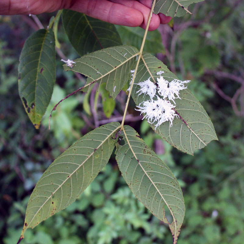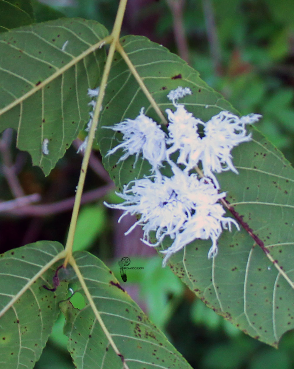 Ranking near the top of the naturalist’s what-the-heck-is-that list is a very strange creature called a butternut wooly worm. A more applicable name would be the coconut flake worm as it looks like a strange type of sugary confection with delicate, snow-white tendrils that move in the lightest breeze. This little oddity feeds on walnut, hickory and butternut leaves and is the larvae of a sawfly (Eriocampa juglandis). Sawflies are related to bees and wasps but don’t sting. They have outbreak years when more defoliation occurs but they do not tend to pose a significant health risk to their host species.