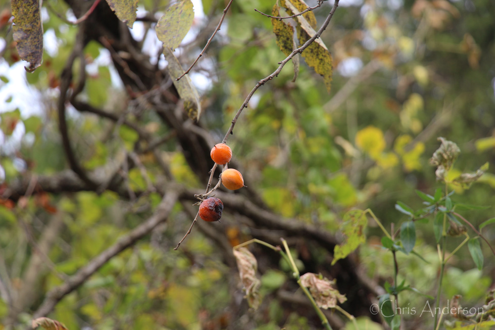 Persimmons (Diospyros virginiana), one of the most prized of the late fall fruits, are steadily ripening on their branches, a treat for almost all forest animals including opossums, raccoons, skunks, squirrels, deer, fox and birds. Many small insects enjoy the bounty as they make quick work of the soft sweet fruit when it falls to the ground in early winter.