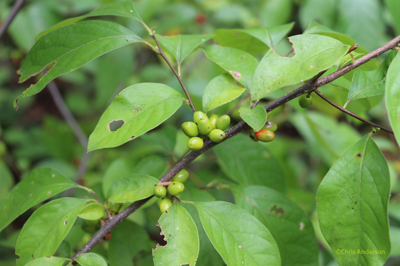 The spicebush is an understory species and grows 10-16 feet at maturity. Along the river trail at the White House Farm, numerous spicebush flourish under the cottonwood and sycamore trees, growing well with the Osage orange and occasional oak.