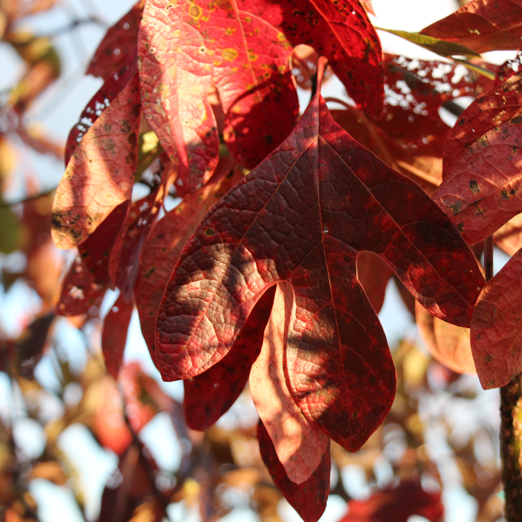 For a splash of color in the landscape, planting sassafras under several red maples or hickories combined with sumac would create a vibrant focal point. A backdrop of dark green evergreens like cedar or pine would highlight the brightly colored autumn foliage.